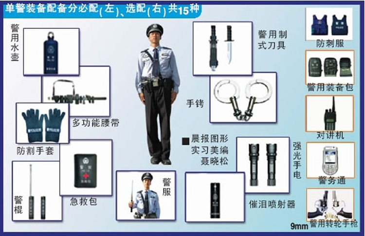 选配项目有:枪,对讲机,警务通,防刺服和警用装备包等。